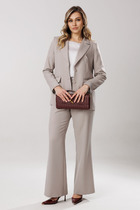 Комплект женский-двойка, из текстильной ткани, жакет удлиненный, полуприлегающего силуэта с центральной бортовой застежкой на пуговицы до линии перегиба лацкана. Спереди рельефные швы от плечевого шва, отрезной бочок и карман с клапаном. Спинка с рельефами от плечевого шва. Рукав втачной, двухшовный. Воротник пиджачного типа. Жакет на подкладке, длина по спинке 67 см, длина рукава 62 см. Брюки прямые, классические, с заутюженными стрелками, по переду обработаны карманы с отрезным бочком, застежка на тесьму-молнию и 1 пуговицу. На задних половинках обработаны вытачки и имитация карманов с листочкой, пояс в брюках притачной, по боковому на резинке. Длина брюк от талии по боковому шву 103 см.