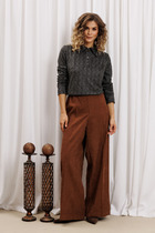 Комплект женский-двойка, из текстильной ткани, жакет удлиненный, полуприлегающего силуэта с центральной бортовой застежкой на пуговицы до линии перегиба лацкана. Спереди рельефные швы от плечевого шва, отрезной бочок и карман с клапаном. Спинка с рельефами от плечевого шва. Рукав втачной, двухшовный. Воротник пиджачного типа. Жакет на подкладке, длина по спинке 67 см, длина рукава 62 см. Брюки прямые, классические, с заутюженными стрелками, по переду обработаны карманы с отрезным бочком, застежка на тесьму-молнию и 1 пуговицу. На задних половинках обработаны вытачки и имитация карманов с листочкой, пояс в брюках притачной. Длина брюк от талии по боковому шву 103 см.