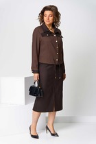 Комплект женский-двойка, из текстильной ткани, жакет удлиненный, полуприлегающего силуэта с центральной бортовой застежкой на пуговицы до линии перегиба лацкана. Спереди рельефные швы от плечевого шва, отрезной бочок и карман с клапаном. Спинка с рельефами от плечевого шва. Рукав втачной, двухшовный. Воротник пиджачного типа. Жакет на подкладке, длина по спинке 67 см, длина рукава 62 см. Брюки прямые, классические, с заутюженными стрелками, по переду обработаны карманы с отрезным бочком, застежка на тесьму-молнию и 1 пуговицу. На задних половинках обработаны вытачки и имитация карманов с листочкой, пояс в брюках притачной. Длина брюк от талии по боковому шву 103 см.