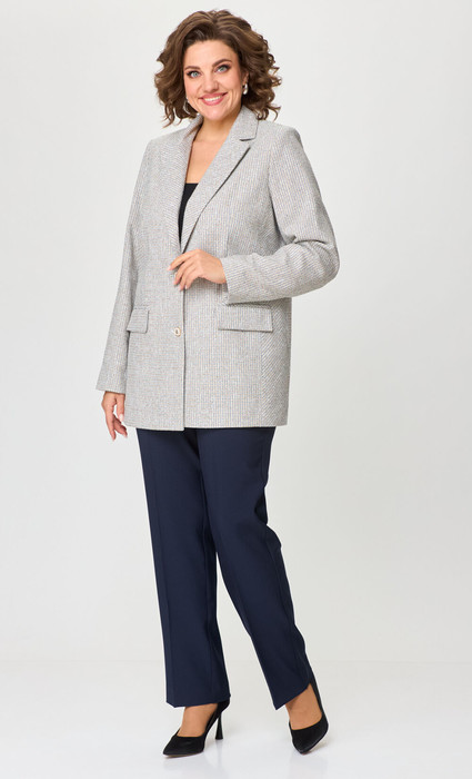 Комплект женский-двойка, жакет удлиненный, из рогожки, полуприлегающего силуэта с центральной бортовой застежкой на пуговицы до линии перегиба лацкана. По переду имеется отрезной бочок и вертикальные вытачки. С прорезными карманами с клапаном и двумя обтачками. Спинка цельная. Воротник пиджачного типа. Рукав двухшовный, втачной. Жакет на подкладке. Длина рукава 63 см, длина по спинке 75 см. Брюки прямые, классические, из текстильной ткани, с заутюженными стрелками, по переду обработаны карманы с отрезным бочком, застежка на тесьму-молнию и 1 пуговицу. На задних половинках обработаны вытачки и имитация карманов с листочкой, пояс в брюках притачной. Длина брюк от талии по боковому шву 103 см.