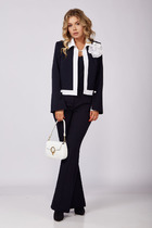 Комплект 2-х предметный состоит из жакета и и брюк. Двубортный жакет, свободного кроя, на подкладке. По переду имеется отрезной бочок и вертикальные вытачки. С прорезными карманами с клапаном и двумя обтачками. Спинка цельная. Воротник пиджачного типа. Рукав двухшовный, по низу рукава обработана шлица на петли-пуговицы. Длина рукава 63 см, длина по спинке 74 см. Классические брюки, прямые, слегка заужены к низу,заутюжены стрелки,по переду обработаны карманы с отрезным бочком,застежка на тесьму-молнию и 1 пуговицу.На задних половинках обработаны вытачки и имитация карманов в рамку с двумя обтачками,пояс в брюках притачной. По низу брюк в боковом шве есть небольшой разрез. Длина брюк от талии по боковому шву 96 см.
