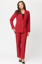 Комплект 2-х предметный состоит из жакета и брюк. Двубортный жакет, свободного кроя, на подкладке. По переду имеется отрезной бочок и вертикальные вытачки. С прорезными карманами с клапаном и двумя обтачками. Спинка цельная. Воротник пиджачного типа. Рукав двухшовный, по низу рукава обработана шлица на петли-пуговицы. Длина рукава 63 см, длина по спинке 74 см. Классические брюки, прямые, слегка заужены к низу,заутюжены стрелки,по переду обработаны карманы с отрезным бочком,застежка на тесьму-молнию и 1 пуговицу. На задних половинках обработаны вытачки и имитация карманов в рамку с двумя обтачками, пояс в брюках притачной. По низу брюк в боковом шве есть небольшой разрез. Длина брюк от талии по боковому шву 94 см.
