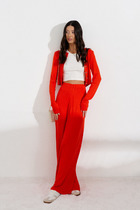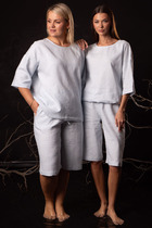 Комплект 2-х предметный из текстильной ткани состоит из жакета и и брюк. Двубортный жакет, свободного кроя, на подкладке. По переду имеется отрезной бочок и вертикальные вытачки. С прорезными карманами с клапаном и двумя обтачками. Спинка цельная. Воротник пиджачного типа. Рукав двухшовный, по низу рукава обработана шлица на петли-пуговицы. Длина рукава 63 см, длина по спинке 74 см. Классические брюки, прямые, слегка заужены к низу,заутюжены стрелки,по переду обработаны карманы с отрезным бочком,застежка на тесьму-молнию и 1 пуговицу.На задних половинках обработаны вытачки и имитация карманов с листочкой, пояс в брюках притачной. Длина брюк от талии по боковому шву 97 см.