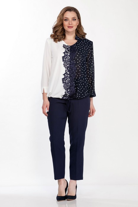 Комплект женский двухпредметный состоит из блузки и брюк. Блузка нарядная выполнена из блузочной ткани контрастных цветов свободного силуэта. Вырез горловины V-образный с воротником на стойке, рукав 3/4 с притачным манжетом, низ на кулиске затягивается на шнурок. Полочка по центру украшена кружевом. Длина блузки по спинке 70 см, длина рукава 52 см. Брюки классические с высокой посадкой, полуприлегающего силуэта, выполнены из плотной костюмной ткани с добавлением эластана. Пояс без резинки, с застежкой молнией на пуговицу. В боковых швах карманы с листочкой. Длина брюк 103 см.