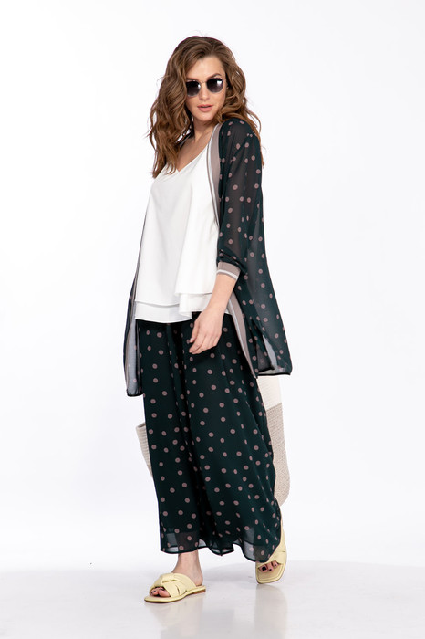 Комплект женский трехпредметный, состоит из кардигана, блузона и кюлот. Кардиган без застежки, рукав втачной 3/4 с притачным довязом. Длина кардигана 83 см. Блузон двухслойный без рукава на широких брителях. Кюлоты на резинке с карманами в боковых швах и на подкладке. Длина кюлот 100см.