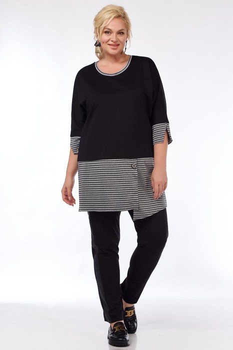 Костюм женский свободного силуэта, спорт.Состоит из туники и брюк. Туника с отрезной декоративной деталью по переду и спинке.Рукав цельнокройный с манжетом.Брюки с ломпасом из экокожи и карманами в боковом шве, пояс на резинке.