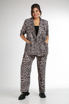 Костюм женский полуприлегающего силуэта, состоит из джемпера и брюк. Джемпер с подрезом по центру переда, с декоративным украшением, рукав втачной 3/4 с резинкой по низу, в боковых швах разрезы. Брюки с застежкой на молнию и пуговицу, в боковых швах карманы.