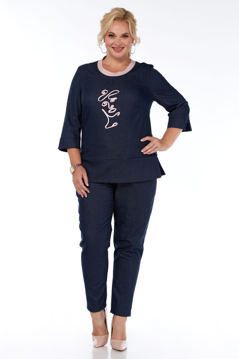 Костюм женский, полуприлегающего силуэта. Джемпер с апплекацией по переду. Рукав втачной с отрезной манжетой. Горловина обработанна трикотажным довязом. Брюки на резинке по поясу, c карманоми в боковых швах.
