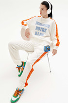 Комбинезон выполнен в спортивном стиле, отрезной по линии талии, с бретелями застегивающими на металлическую застежку. По переду на груди накладной карман. По брюкам в боковых швах лампасы, по переду в боковых швах брюк на уровне бедер карманы. На задних половинках накладные карманы.