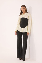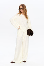 Брюки зауженные к низу с ассиметричным низом и разрезом в боковом шве. Застежка по линии банта на молнию. Верх брюк на поясе с резинкой по спинке.