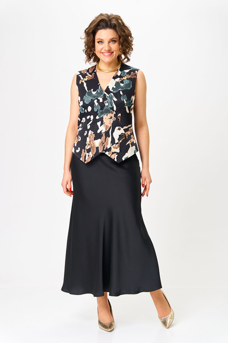 Стильный женский комплект, выполнен из атласа, жилет по переду из атласа с принтом, спинка и юбка из однотонного.