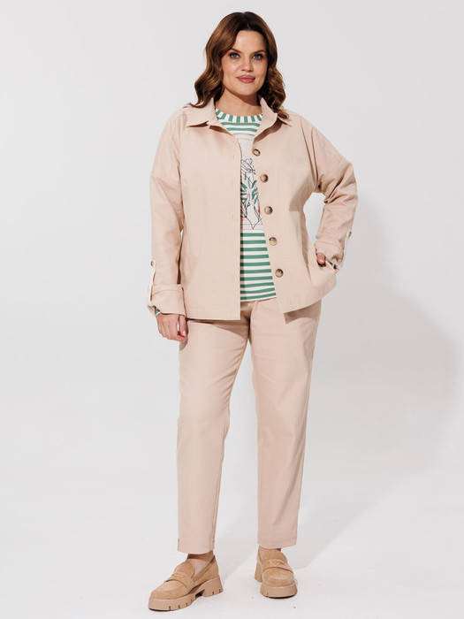 Стильный комплект, в стиле спорт- шик из хлопковой ткани. Жакет полуприлегающего силуэта, длиной до линии бедер, со спушенной линией плеча. Детали переда с кокеткой, с нагрудной вытачкой, с центральной застежкой на петли пуговицы. На боковых частях переда расположены боковые карманы. Спинка с кокеткой, средним швом. Рукава втачные с декоративными патами, придавая образу изюминку. Брюки с поясом на резинке на петлю пуговицу, по переду брюк карманы, слегка заужены к низу. Отличный вариант для прогулок с друзьями, выхода в свет, путешествий.