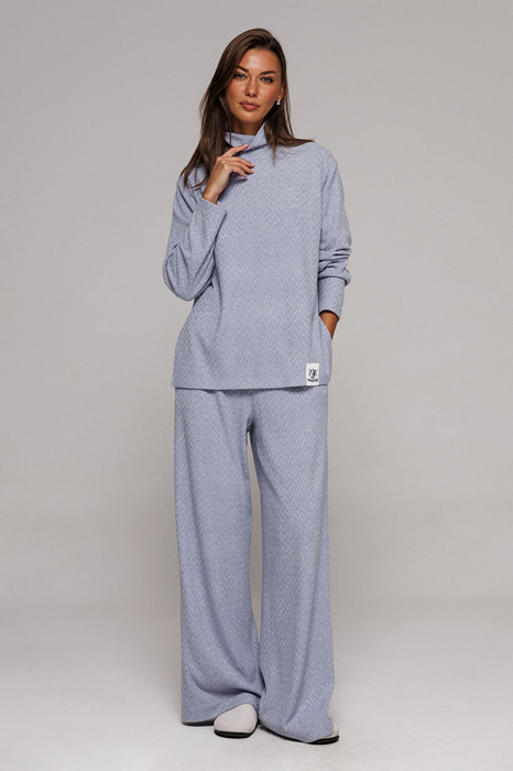 Костюм 2-ух предметный, состоящий из джемпера и брюк. Джемпер прямого силуэта со спущенной линией плеча. Рукав втачной. По переду нашивка "BUTER". Внизу по боковым швам обработаны высокие разрезы. Воротник-стойка цельнокроеная.  Брюки на притачном, отстроченном поясе с резинкой. Брюки от линии бедра слегка расширены к низу, с карманами в боковых швах.