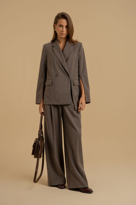 Комплект женский двухпредметный из смесовой ткани в полоску. Жакет прямого силуэта.  Вырез горловины оформлен воротником пиджачного типа. Застежка - двубортная на петли с пуговицами. Линия плеча слегка расширена и усилена плечевыми накладками. Рукава двухшовные. На спинке в рельефах выполнены высокие шлицы. Спереди слева и в швах рукавов - декоративные элементы в виде молний, которые при желании можно расстегнуть. Жакет посажен на подкладку. Брюки свободного покроя со стрелками. Пояс - отрезной с эластичной тесьмой и застежкой на брючный крючок. в боковых швах - карманы с отрезными бочками. Есть шлевки для ремня.