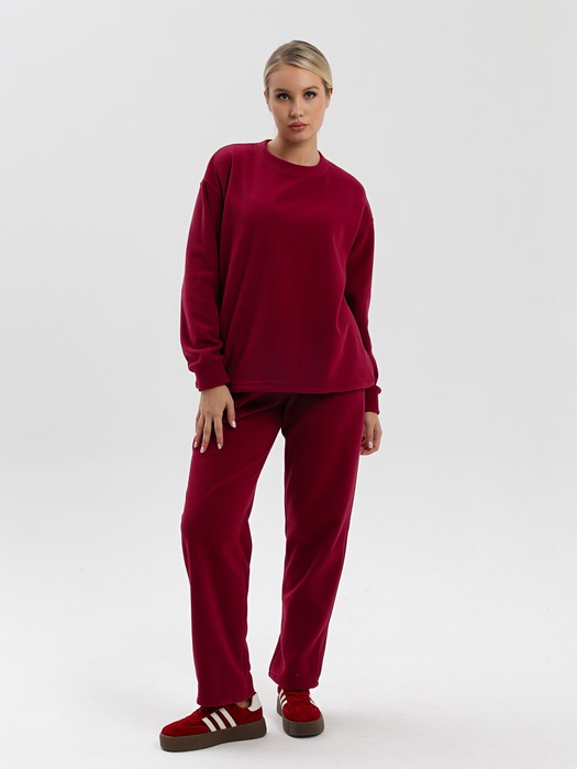 Костюм молодежный из гладкокрашенного полотна «флис», состоящий из джемпера и брюк. Джемпер – прямого силуэта, с длинными втачными рукавами, горловиной овальной формы, обработанной втачной планкой. На левом рукаве выполнена вышивка, низ обработан манжетами. По низу изделия подгибка с вложением эластичной тесьмы, регулируемой по длине фиксаторами.Брюки – длинные, свободные, на притачном поясе с эластичной тесьмой внутри, карманами в боковых швах. Нижние срезы обработаны подгибкой с вложением эластичной тесьмы, регулируемой фиксаторами.
