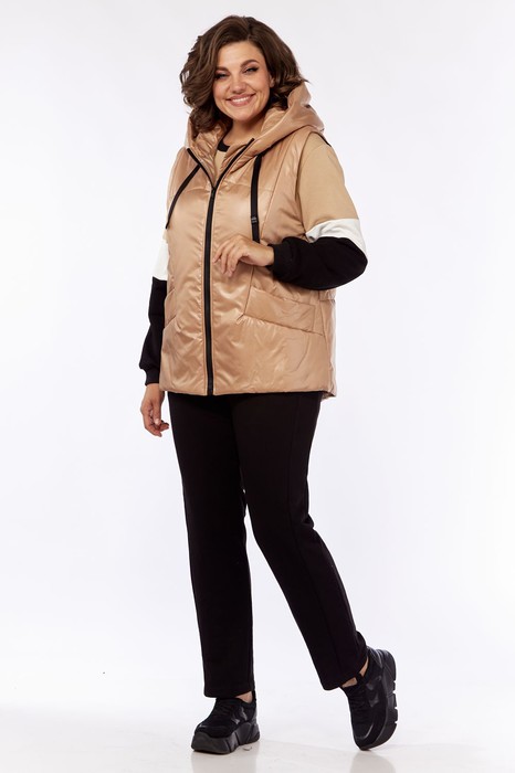 Комплект брючный(жилетка+кофта+брюки)Брюки зауженные к низу с поясом на резинке и ламапасами по бокам в цвет брюк. Джемпер 3-х цветный. Спинка из основной ткани , а перед  с двумя подрезами по горизонтали. Жилет из плащёвой ткани с застёжкой "молния". Перед с отрнезными бочками и карманами с листочкой. Спинка со стёжкой. Капюшон с кулисой и шнуром.