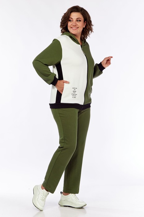Комплект брючный из трикотажного полотна 3-х цветов, брюки зауженные с поясом на резинке, со шнуром и боковыми карманами в швах. Толстовка с застёжкой "молния". Спинка с полосой по центру из отделочной ткани и печатью по светлой детали. Перед с бочками из отделочной ткани. Правая часть светлая украшена печатью. Карманы боковые обработаны в швах рельфах. Воротник-капюшон. Рукав втачной одношовный. По низу изделия и рукавов -довязы.