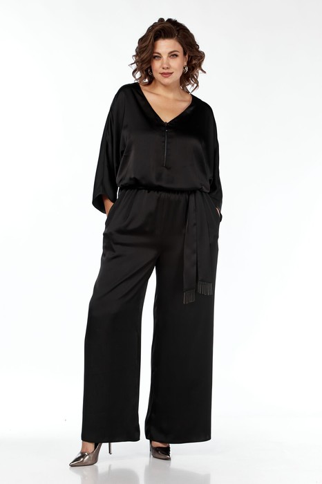 Комбинезон женский свободного кроя. Верхняя часть с потайной молнией и средним швом на спинке, и V-образным вырезом. Декоративная молния по переду. Нижняя часть с боковыми карманами в швах. По линии талии притачной пояс с резинкой. Съемный пояс украшен бахромой на концах. Рукав цельнокройный "летучая мышь".