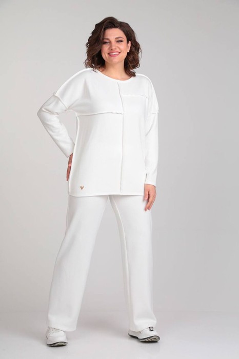 Комплект брючный : джемпер и брюки из трикотажного полотна. Джемпер с разрезными на 4 части передом и спинкой,швы обработаны припусками на лицо. Горловина округллой формы обработана распошивочным швом. Низ рукава и изделия тоже обработаны распошивочным швом. Брюки прямые. Цельнокроенный пояс на резинке.