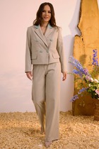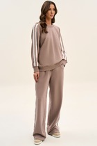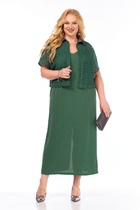 Комплект женский состоит из блузона и сарафана. Сарафан полуприлегающего силуэта, на бретелях, со средним швом на спинке, который заканчивается разрезом. По переду нагрудные вытачки, в боковых швах обработаны карманы. Блузон свободного кроя со спущенной линией плеча. Без застежки. Воротник стояче-отложной с отрезной стойкой. Внутренние срезы окантованы.