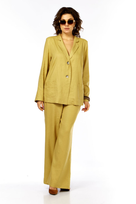 Комплект брючный состоит из жакета и брюк. Жакет полуприлегающего силуэта с центральной застежкой  на петли и пуговицуы, по спинке средний шов, по переду-кокетка , нагрудные вытачки, накладные карманы. Рукав втачной, двухшовный. Воротник стояче-отложной с открытыми бортами. Брюки широкие. Верхний срез обработан поясом с резинкой, застежка на тесьму-молнию, петлю и пуговицу. На задней половинке вытачки, на передней половинке складки, в боковых швах карманы. По поясу-шлевки.