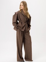 Комплект брючный состоит из блузы и брюк. Блуза прямого кроя со спущенной линией плеча. Перед с кантом из отделочной ткани по среднему шву. Левая часть переда украшена печатью. Спинка со средним швом. Рукав одношовный с кантом по окату и манжетам из отделочной ткани. Горловина округлой формы  с кантом. По бокам обработаны разрезы. Брюки прямые, свобюдного кроя. По боковым швам кант из отделочной ткани и карманы. Пояс притачной, на резинке.