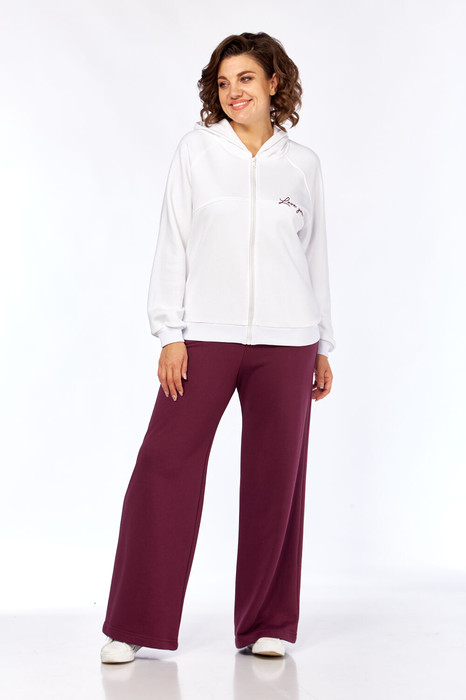 Комплект брючный.Кофта свободного кроя с центральной застежкой на тесьму-молнию. Рукав покроя реглан с притачным манжетом по низу (довяз). По переду и спинке кокетки. Капюшон со средним швом. По низу изделия отделочный пояс (довяз). В качестве отделки используется вышивка. Брюки широкие, верхний срез обработан поясом с резинкой. В боковых швах обработаны карманы.