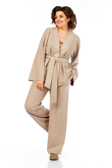Комплект брючный состоит из брюк, топа и кардигана-кимано. Брюки прямые, широкие с боковыми карманами и поясом на резинке. Топ из отделочной ткани на регулирующихся бретелях с вытачками по переду. Кардиган-кимано длиной до линии бедра, запахивается и завязывается съемным поясом. Рукав втачной одношовный со спущенной линией плеча. По переду шировкая планка.