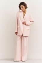 Комплект брючный состоит из кофты и брюк. Кофта свободного кроя покроя реглан. По низу рукава манжет. Капюшон с центральным швом. По боковым швам разрезы. В качестве отделки используется кружево по рукаву и капюшону. Брюки широкие, в боковых швах обработаны карманы. Верхний срез обработан поясом с резинкой.