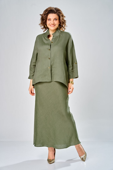 Комплект женский состоит из юбки и рубашки. Рубашка свободного кроя с центральной застежкой на петли-пуговицы. Спущенное плечо, втачной одношовный рукав (фиксируется отворот на петлю и пуговицу) по переду прорезные карманы с листочкой. Воротник-стойка. Юбка длинная, верхний срез обработан поясом на резинке с застежкой на петлю и пуговицу в левом боковом шве с потайной тесьмой-молнией. Юбка кроенная по косой. На заднем полотнище талиевые вытачки.