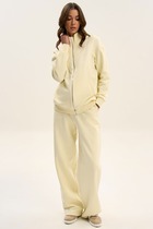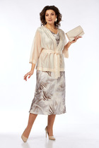 Комплект брбчный состоит из жакета и брюк. Жакет полуприлегающего силуэта с центральной застежкой на петли и пуговицы с открытыми бортами. По переду талиевые вытачки, нагрудные вытачки, накладные карманы, рельефные швы бочка. По спинке средний шов со шлицей, рельефные швы бочка. Рукав втачной 2-шовный. Воротник притачного типа со сточкой. Внутренние срезы-окантованы, жакет без подкладки. Брюки широкие, верхний срез обработан поясом с застежкой на петли и пуговицы, с застежкой на тесьму молнию по переду. В боковых швах карманы. На передней половинке три складки. Используется две ткани.