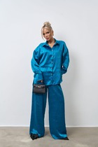 Брюки - палаццо с центрально застежкой на тесьму молнию с гульфиком и откоском; с притачным поясом со шлевками, застегивающимся на 1 прорезную петлю и пуговицу. Задняя часть пояса - на резинке. ПП брюк со складками, переходящими в стрелки и боковыми карманами. ЗП брюк с 2-мя парами таллиевых вытачек и стрелками.