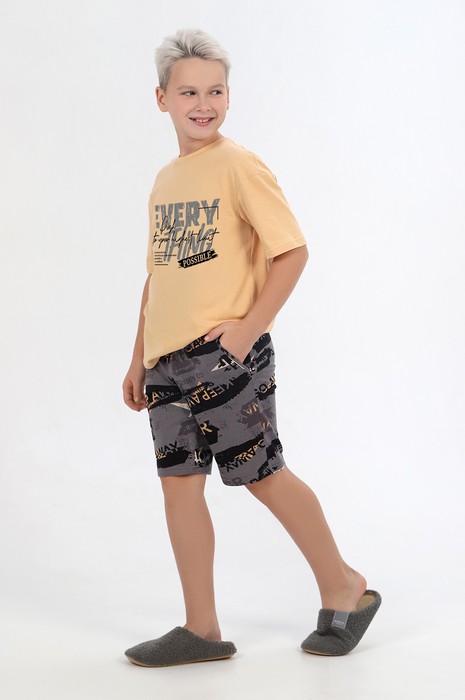 Костюм для мальчика ,состоящий из футболки и шорт. Футболка - из гладкокрашеного полотна "кулирка", классического покроя, с короткими втачными рукавами, горловиной овальной формы, обработанной втачной планкой, и принтом вцентре переда, выполненным в технике шелкографии. Шорты - из полотна с набивным рисунком, удлиненные, на притачном поясе с эластичнойтесьмой внутри и карманами в боковых швах, входы в которые окантованы основным материалом.