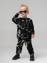 Костюм для мальчика из трикотажного полотна "кулирка" в комбинации двух видов: гладкокрашенного и с рисунком в крупную клетку, сочетающихся между собой по цвету, состоящий из джемпера и брюк. Джемпер - из гладкокрашеного полотна, свободного покроя, с длинными втачными рукавами и приспущенными плечами, с горловиной овальной формы и тематическим принтом, выполненным в технике шелкографии. Горловина, нижние срезы рукавов и низ изделия обработаны подгибкой с отделочным широким кантом контрастного цвета. Брюки - из полотна в клетку, свободного покроя, прямые, на притачном поясе с эластичной тесьмой внутри, с карманами в боковых швах. Нижние срезы обработаны подгибкой.