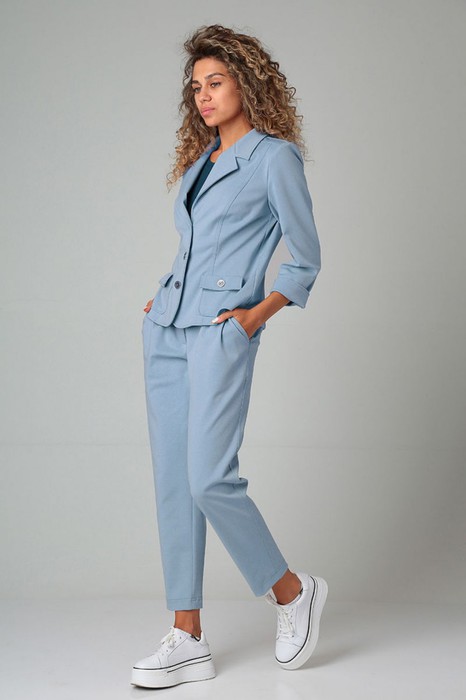 Стильный брючный костюм 2-ка. Жакет полуприлегающего силуэта, застежка на 3 пуговицы. Функциональные накладные карманы. Рукав три четверти с отворотом. Жакет без подкладки. Брюки свободного силуэта из текстильной ткани с карманами, средней посадки на поясе- обтачке со шлевками, застежка молния спереди.