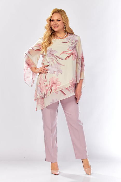 Уникальный наряд, сочетает в себе изысканный дизайн. Идеально подходит для торжественных выходов и не только! Женственный костюм состоит из блузы и брюк. Блуза выполнена в романтичном стиле. Интересным решением служит ассиметричный, двухуровневый низ изделия, этим создает легкий, струящийся эффект. Рукав втачной, свободный, расширенный к низу. Горловина аккуратной округлой формы. Брюки классические с заутюженными стрелками, слегка зауженные к низу, оформлены притачным поясом, частично на резинке. Застежка спереди брюк на молнию и петлю-пуговицу