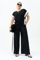 Комплект женский, состоящий из кардигана и брюк. Кардиган прямого силуэта, со спущенной линией плеча. Рукав длинный, заканчивающийся притачной манжетой. Спинка с горизонтальной кокеткой. Вырез горловины V-образный. По краю борта, горловине, спинке и низу кардигана притачные планки. Кардиган застегивается на притачную молнию либо на петли-пуговицы. Брюки прямого силуэта, по переду карманы и имитация застёжки. Пояс притачной с резинкой. Комплект декорирован отделочными строчками, нитками контрастного цвета и частично открытыми срезами.