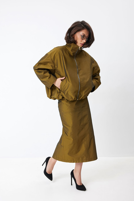 Комплект женский, состоящий из куртки и юбки. Куртка о-образного силуэта на подкладке. Застежка на молнии. Спинка с декоративной кокеткой, придающей конструкции более изящный силуэт. Передняя часть с рельефом и карманом с листочкой. Воротник стойка, линия плеча спущенная. Рукав втачной со средним швом. Низ куртки со сборкой, добавляющая стильный акцент. В юбке силуэт прямой, зауженный к низу, подчеркивающий фигуру. Переднее и заднее полотнище с подрезами и вытачками. Заднее полотнище со средним швом, шлицей и патайной молнией. Переднее полотнище со средним швом, обеспечивает симметричный внешний вид. Верх юбки обработан обтачкой. Универсальный дизайн сочетается с различными предметами гардероба.