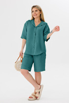 Комплект: блузка + шорты. Комплект выполнен из плательно-блузочной ткани с принтом. Блузка прямого покроя, длиной до линии бедер. Спереди застежка с планкой на пуговицы. Спинка цельная. Воротник стояче-отложной. Плечевой шов удлинен. Рукав покроя "кимоно", длиной выше линии локтя. Шорты расширены к низу, на притачном поясе с эластичной тесьмой. Спереди на боковых швах карманы. По переду пояса петли и протянут шнур. Шорты на притачной по низу подкладке. Топ в комплект не входит, его можно приобрести отдельно арт.2427.