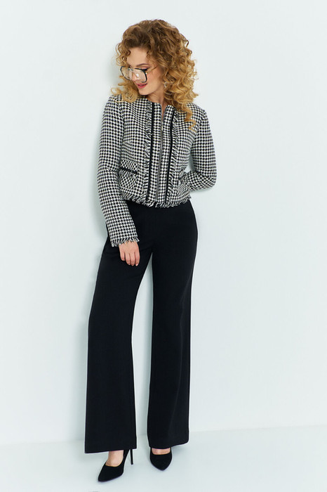 Костюм брючный женский состоит из жакета и брюк, жакет укороченный, свободного кроя, по полочке жакета расположены накладные карманы и декоративные элементы вдоль молнии. Горловина округлая, рукав втачной длинный. Застёжка - молния. Жакет на подкладке. Брюки классические с завышенной посадкой. на притачном поясе с резинкой, в боковых швах расположены функциональные карманы, застежка молния на гульфике.