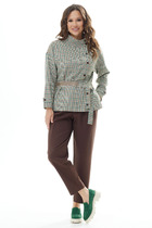 Костюм женский, состоит из жакета и брюк, выполнен в сочетании костюмных тканей. Жакет свободного кроя, не приталенный. Полочка жакета выполнена в стиле классического жакета с прорезными карманами - рамками и английским воротником (отложной воротник с лацканами). Спинка жакета с отрезной кокеткой выделенной ярким кантом, по низу жакета частичная эластичная тесьма. Рукав втачной длинный, по задней (джинсовой) части рукава расположена резинка. Брюки классического кроя, прямые от бедра, с высокой посадкой, в боковых швах расположены функциональные карманы. Пояс в брюках втачной с резинкой, застежка молния на гульфике и петля-пуговица