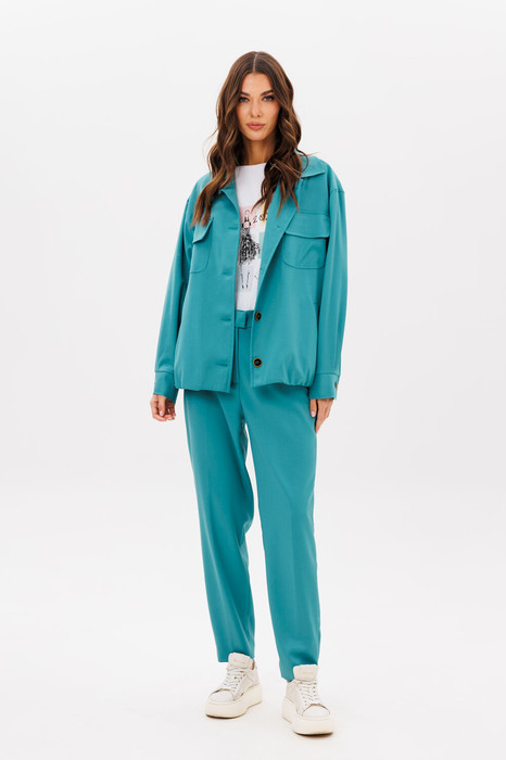 Свободный силуэт с заниженной линией плеча, рукав, расширенный в области оката, центральная застёжка на петли и пуговицы, стояче-отложной воротник.