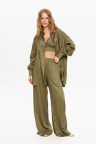 Жакет из необычного по текстуре материала с вкраплением пайетки, брюки из полотна без пайетки. Полуприлегающий силуэт пиджака с центральной застёжкой, круглым вырезом горловины и втачным покроем. Полочка с фигурным рельефом, спинка с фигурным рельефом, центральным швом и плечевыми вытачками. Рукав двухшовный.