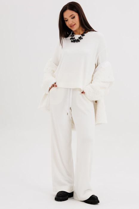 Такой вариант неформального костюма можно отметить отдельно-это настоящий шик, который в любой обстановке смотрится по-особенному. Невероятное ощущение расслабленности и комфорта обеспечивает удобный покрой и тактильно уютный трикотаж с эффектом вельвета. Брюки свободного кроя, прямые, с наклонными боковыми карманами , на эластичном поясе с люверсами и отделочным шнуром. Джемпер рубашечного покроя,  свободный, слегка укороченный. Горловина круглая с притачной обтачкой. Рукав рубашечный расширенный к низу.