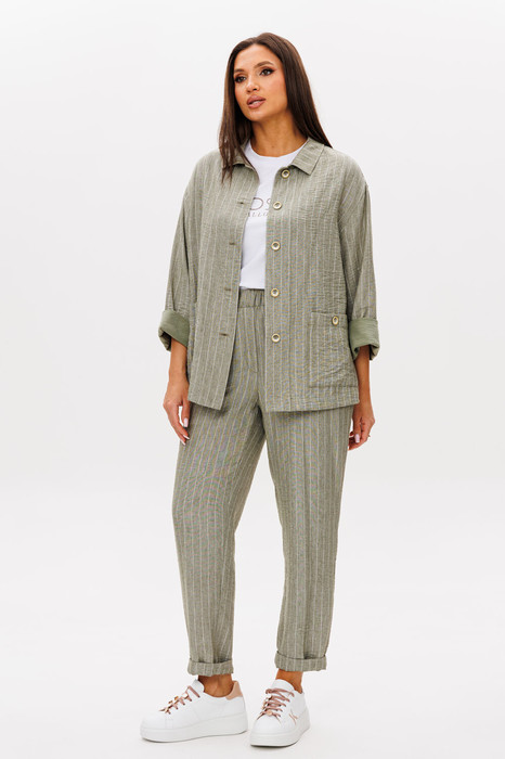 Жакет свободного упрямленного силуэта, рубашечного покроя с центральной застежкой, рубашечным рукавом и воротником, разноуровневым низом. Полочка с накладным нижним карманом. Спинка с отрезной кокеткой и легкой бантовой складкой. Рукав с отложной манжетой, по боковым швам разрезы. Длина жакета около 80 см. Длина рукава с плечом около 74 см. Длина брюк около 102 см.