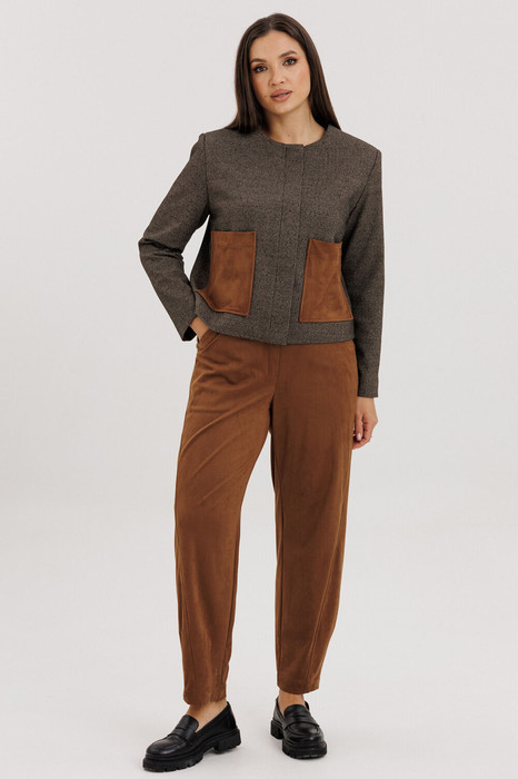 Жакет прямого кроя с округлым вырезом и длинными рукавами дополнен эффектными замшевыми карманами — стильный акцент, который выделит вас из толпы.