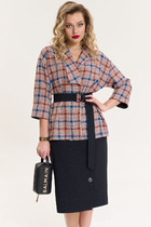 Свободный силуэт, рубашечный покрой, рукав короткий, эффектная драпировка по переду и кокетливый пояс-завязка по спинке.