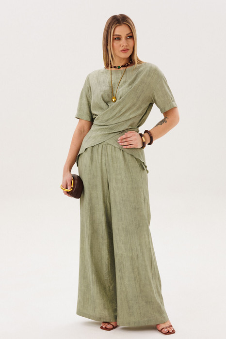 Этот стильный костюм — воплощение летней элегантности и комфорта. Модель выполнена из вискозной ткани с эффектом жатки, что не только актуально в этом сезоне, но и крайне практично: одежда меньше мнется и сохраняет безупречный вид в течение всего дня.