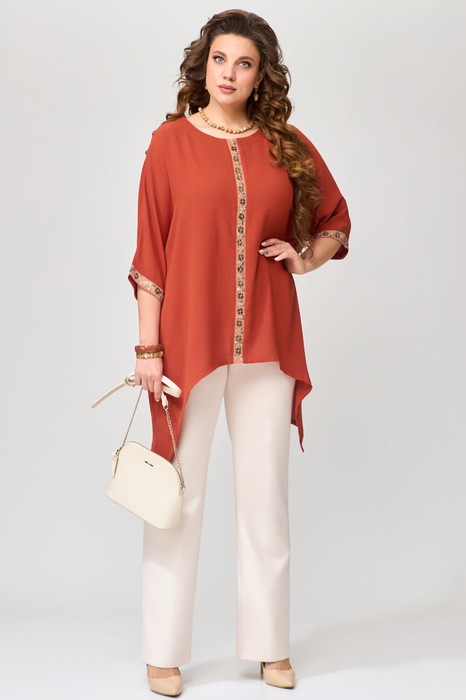 "Женский комплект ""Удеса"" состоит из брюк и туники свободного покроя. Туника оверсайз выполнена из текстильной ткани без подкладки, ткань легкая, стрейч и очень практичная в носке. Рукав цельнокроеный, горловина обработана обтачкой, обтачка закреплена отделочной строчкой. Низ изделия обработан швом в подгибку, по центру полочки нашита тесьма  (монетки на сетке), низ рукава тоже обработан декоративной тесьмой.
