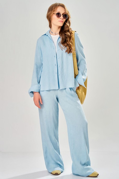 Женский брючный комплект "Магрита" выполнен из текстильной ткани "Нотус" и состоит из брюк и рубашки. Этот комплект выполнен из натуральных тканей (хлопка и льна), а также для эффекта создания легких полосочек используется во составе нейлон.